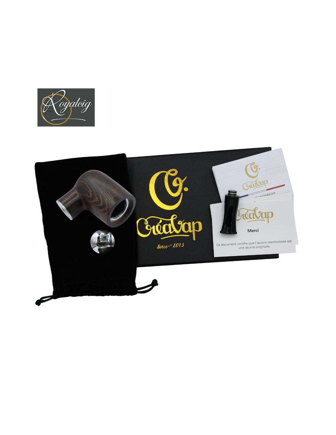 Esta versión en caja es ideal para los usuarios ya equipados con un clearomiser y una batería. Incluye el cuerpo de la pipa, el vástago de metal negro y un estuche rígido. Para una versión lista para usar, también está disponible un kit completo, que incluye todos los elementos necesarios para vapear.
